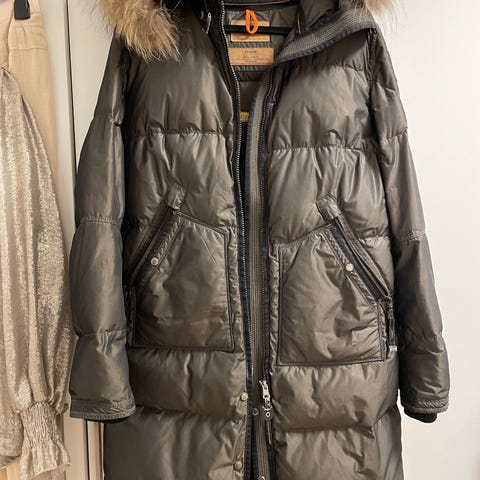 Parajumpers vinterjakke for kvinner i størrelse M. Jakken er beige og laget av dun, noe som gir god isolasjon og varme. Den har hette med pelskant og er designet for kalde værforhold. Mangler merke på armen, det har falt av for et par år siden. Eldre modell. Jakken har ellers ingen skader, og tåker vask i maskin uten skyllemiddel og tørk i trommelen. Hetten må da tas av.