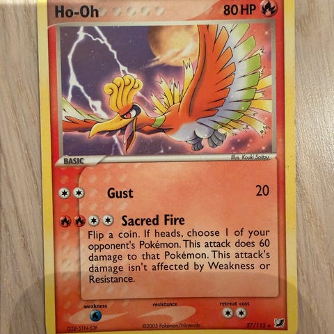 Jeg selger en holo Ho-Oh fra Call Of Legends for 200 kroner. Har prøvd å sette pris ut fra tilstand. Be gjerne om flere bilder. Jeg har også mye annet Pokemon til salgs, så ta gjerne en titt på mine andre annonser.