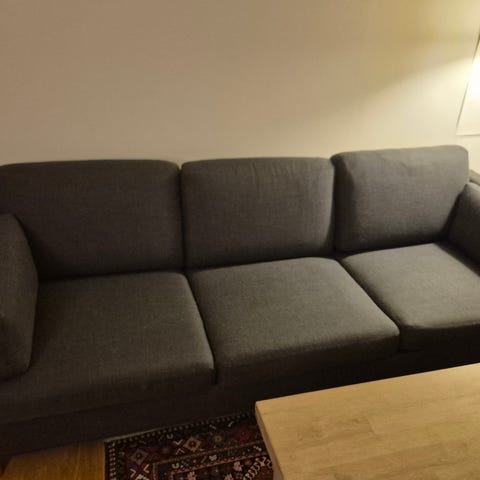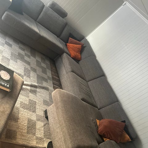 Stor u-sofa sort med grå puter. Pent brukt uten flekker og rifter. Avtakbare trekk. Sort bord kan medfølge. Må hentes.