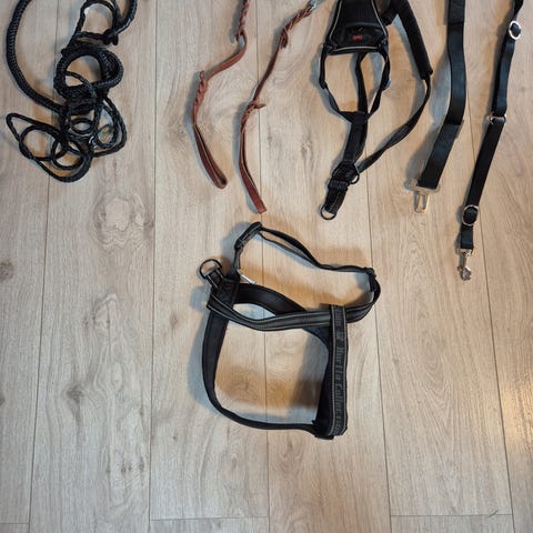 Selger fem hundegård, et halsbånd og en kroppssele/ trekksele