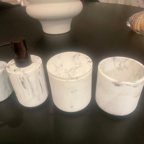 Marmor såpedispenser og tannbørste oppbevaring.