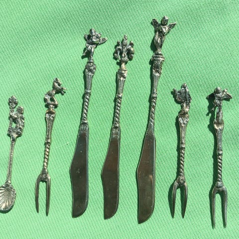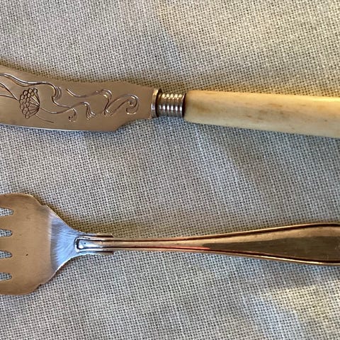 6 ubrukte kniver og 6 brukte gafler plett i Korall