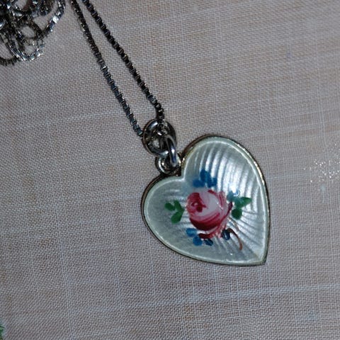 Anheng, hjerte, hjerteanheng, smykke, halskjede, kjede, halssmykke, murano, glass, rødt hjerte, blått hjerte, grønt hjerte, hjerte i glass, sølv, vintage, glasshjerte, smykke, samlet,