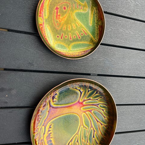 En original vintage David Andersen of Norway veggplakett/tallerken i emalje på kobber fra 1960-tallet. Tallerkenen har et flott design fra midten av århundret og er stemplet på baksiden. I veldig fin stand. Har noen spor i emaljen som vist på bildene. Ingen avskallinger, fargen er fin og den ser bra ut. Måler ca. 15 cm i bredden. Selges som den er og som vist på bildene.