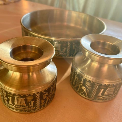 Koselig metallspann, alt fungerer som det skal. En del mindre bulker. Det rommer over 2 liter og er 19 cm høyt og 14 cm i diameter i bunnen. Rømmebegeret er med for å vise størrelsen. Se gjerne mine andre annonser.