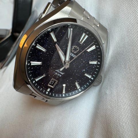 Pent brukt Erebus automatisk GMT. Klokken måler 41 mm i diameter, og har safirkrystall og matt kjermisk bezel i svart og blå. Utskriven er blå med kornete tekstur.