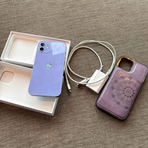 Apple iPhone 12 smarttelefon i svart farge. Baksiden av telefonen er knust. Det er lagt gjennomsiktig teip på baksiden.