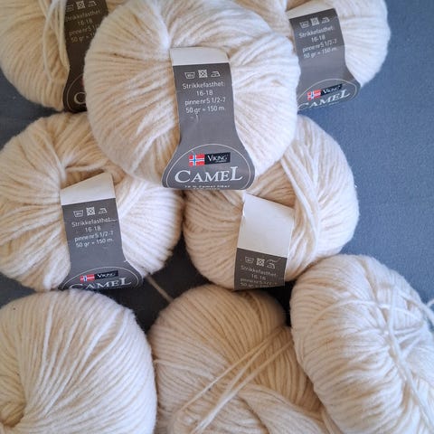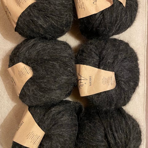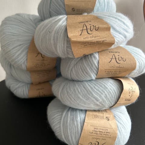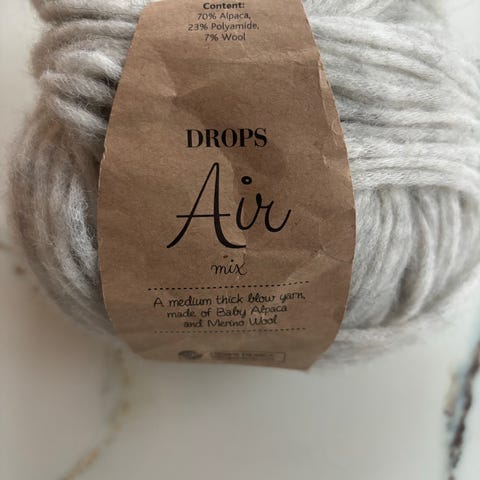 Drops Air garn. Hele nøster i fargene natur (01) og perlegrå (03) og rest i brun (05).