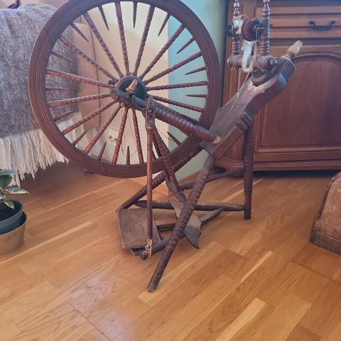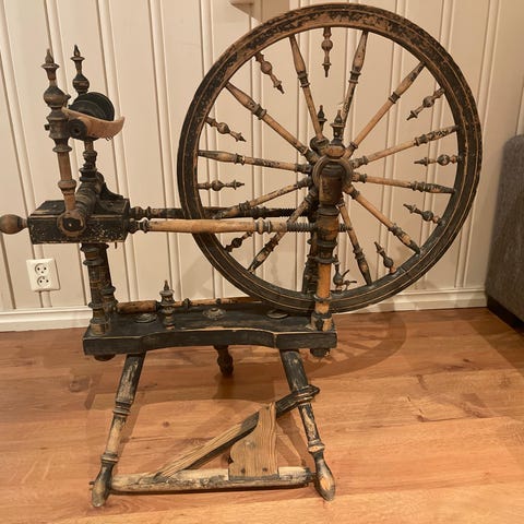Antikk trespinnemaskin laget av tre. Tradisjonelt håndverk brukt til spinning av garn. Inkluderer roterende hjul og spindelmekanisme. Egnet for samlere eller som dekorativt element.