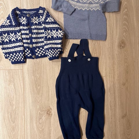 Fire stk hjemmestrikket illebror og lillesøster romper i str 1-3 mnd selges samlet. Alle er lite brukt og fremstår som nye. Strikket i 100% ull.