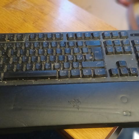 Tastatur tilleggsutstyr med kabel. Sort farge, standard tastaturoppsett, inkludert håndleddstøtte. Med lys i tastene.