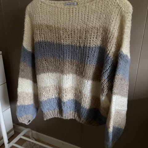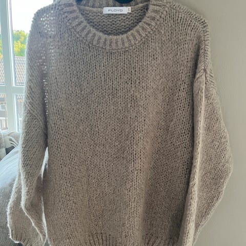 Superfin strikkegenser fra Floyd, Abelone, nydelig blåfarge. Høy og vid hals, og ballongermer. Str XXL. 15% ull og mohair. Best fargeangivelse på de tre første bildene. Pent og lite brukt.