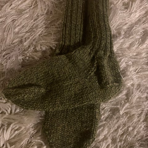 Har strikket inn forsterkelsestråd I foten så ikke det blir så fort hull.