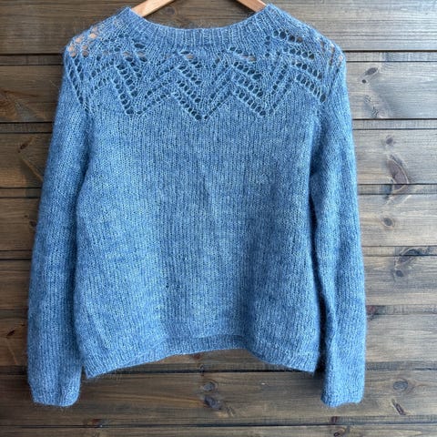 Den andre er Tiril Hullgenser. Den er brukt et par ganger. Fremstår litt hårete, men masse bruk igjen. Veldig god og varm. Strikka i Sandnes garn, Børstet alpakka.