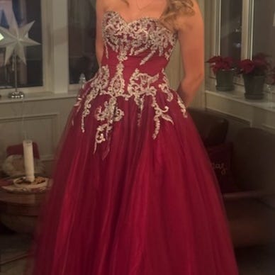 Leier ut nydelig ballkjole fra Lychinor i fargen dyp rød. Kjolen er tilpasset jente 161 cm med høye sko. Str. XS-M grunnet snøring i ryggen. Kan brukes med og uten stoff bak snøringen. Kjolen har «ermer» som er festet med trykknapper og kan tas av dersom man ønsker å bevege armene fritt. Kjolen kostet 8700 kr i 2025. Leies ut fra Rælingen/Lillestrøm.