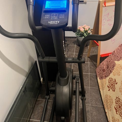 Maskinen har håndtak for overkroppstrening og store fotplater for stabilitet under trening. Treningsutstyr designet for innendørs bruk, egnet for kondisjonstrening og generell fysisk aktivitet.