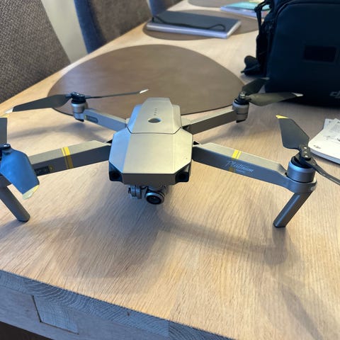 DJI Mavic Pro drone med fjernkontroll, lader, propeller, bæreveske og annet tilbehør - Batteriene fungerer ikke da de har lagt ubrukt en stund, kan potensielt fikses hos spesialist eller kjøpe nye for omtrent 700kr per stk.