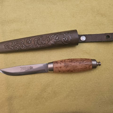 Fra samling selges ubrukt Brusletto Villmann Spesialversjon A/100. Blad av rustfritt 440C stål, lengde 22 cm. Sort lærslire.