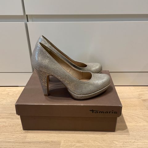 Tamaris hæler i størrelse 38. Skoene har en lys farge med et mønster som gir tekstur. Passer til formelle og uformelle anledninger.
