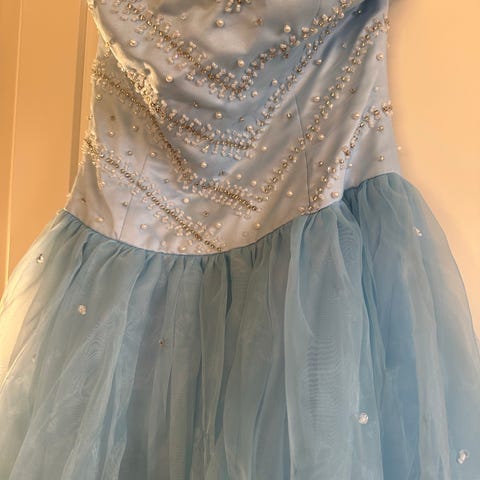 Det er en størrelse XS men har snøre i ryggen som gjør at den kan tilpasses til en S. Min vekt: 48 kg og høyde: 162 og den passer perfekt i lengden. Leies ut for 1200kr med depositum 1500kr. Depositum leveres tilbake når kjolen leveres hel og ren.