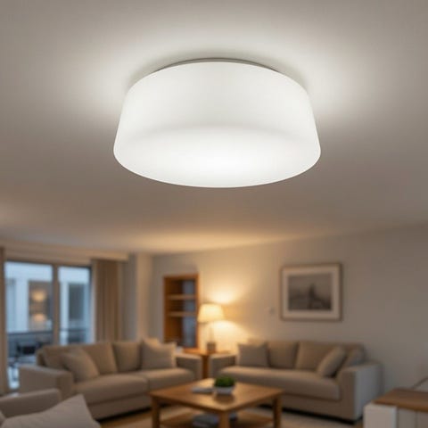 Fin taklampe med trelameller og glass i midten. Hel og fin