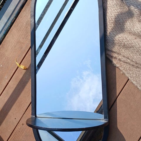 Selger et tidløst og pent speil med avrundede hjørner og tynn messing/gullfarget ramme.