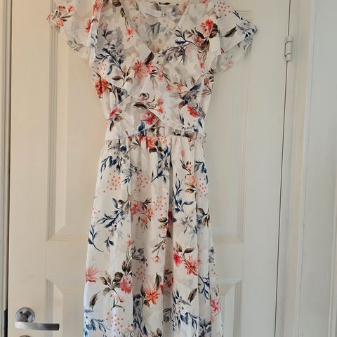 Floyd sommerkjole i størrelse L, laget av polyester. Kjolen har en rosa farge med blomstermønster og lange ermer. Designet for kvinner.