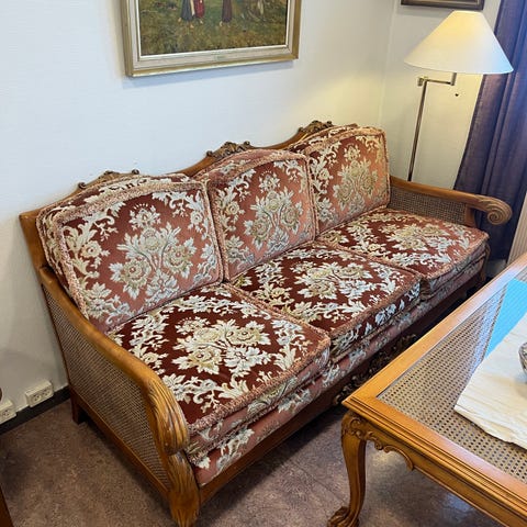 Møblene er i rokokko-inspirert stil med utskårne tredetaljer og buede ben, som er laget på et lite verksted i Sverige i 1936. Trukket i et dekorativt, rødt tekstil med blomster- og fuglemotiv i 2020, som gir et eksklusivt og tidløst uttrykk.