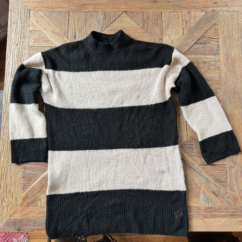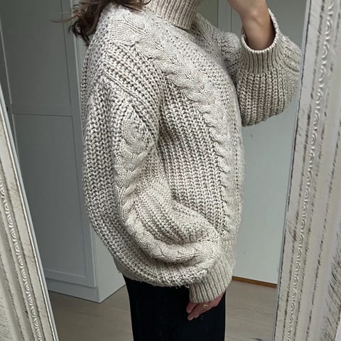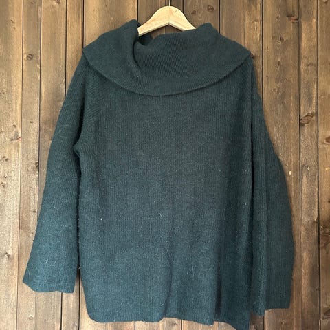 Høyhalset strikkegenser i grå-grønn farge. True to size, men litt kort.