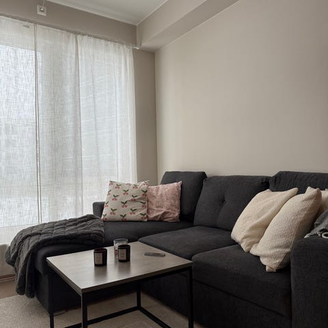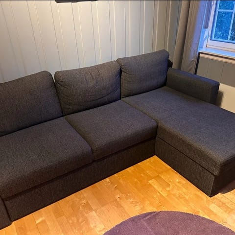 Sofaen er stilig og fungerer supert å ha til vanlig bruk, og har den fordelen at den slås ut til sovesofa for to voksne personer. Den har stått i kjellerstua og har blitt lite brukt, og vi selger, fordi vi skal bruke rommet til noe annet.