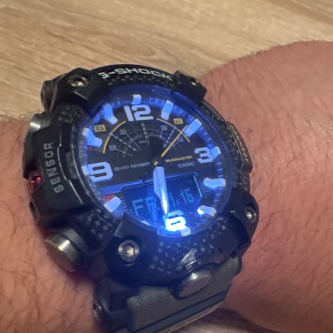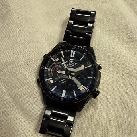 Casio herreklokke med svart rem. Klokken har en rund urskive med flere funksjoner, og en bakside i metall med graveringer. Passer for daglig bruk.