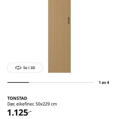 Tonstad dør i eikefiner selges. 50 x 229 cm. Kun åpnet, fremstår som ny. Må hentes