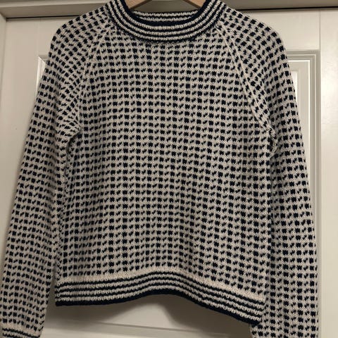 Denne genseren ble strikket til meg for 2 år siden. Den er laget i ull og er veldig fint laget. Men den er nå litt for liten til min komfortabilitet. Jeg foretrekker oversized eller litt store gensere, og denne passer akkurat, er litt trangere enn jeg liker. Jeg er vanligvis en størrelse M i genser men foretrekker L. Siden denne er hjemmestrikket så har den ingen størrelselapp, men den er en S/M