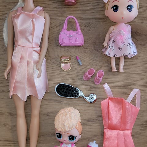 Kan også lage custom dukkepakker med et tema eller i spesifikke farger; Dukkepakker med Barbie eller dukker i lignende størrelse er alltid 200kr, pakker med stor L.O.L-dukke alltid 300kr.