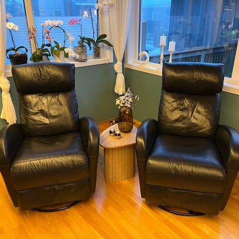 To lenestoler i skinn selges rimelig. Veldig gode å sitte i. Befinner seg på Hoffland på Ellingsøy.