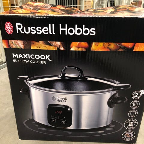 Ubrukt Russell Hobbs Slow Cooker med en kapasitet på 3,5 liter. Laget i rustfritt stål med glasslokk. Egnet for tilberedning av mat over lengre tid ved lav temperatur.
