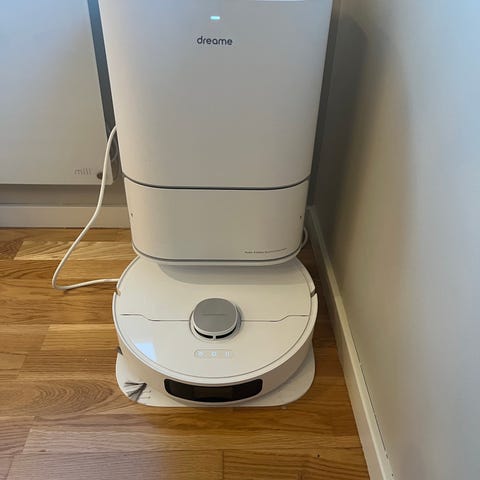 Dreame D10 Plus Gen 2 robotstøvsuger i hvit farge. Utstyrt med selvuttømmende støvbeholder som gir praktisk rengjøring uten hyppig tømming. Designet for automatisert støvsuging av gulvflater.