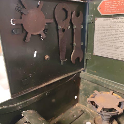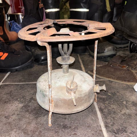 Gammel blikkboks spritbrenner kokeapparat