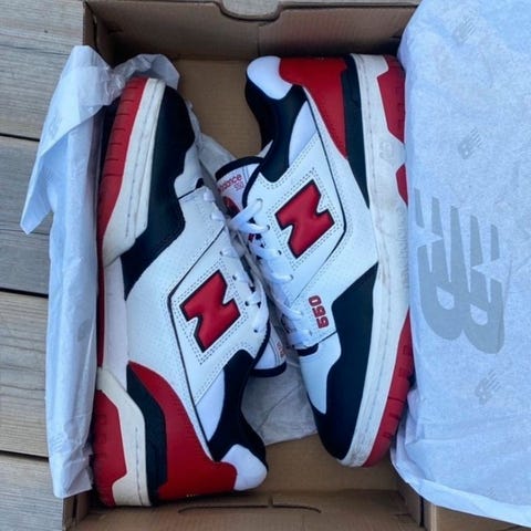 New Balance 550 sneakers joggesko i størrelse 39. Skoene har en hvit base med burgunder detaljer. Designet for daglig bruk og fritidsaktiviteter.