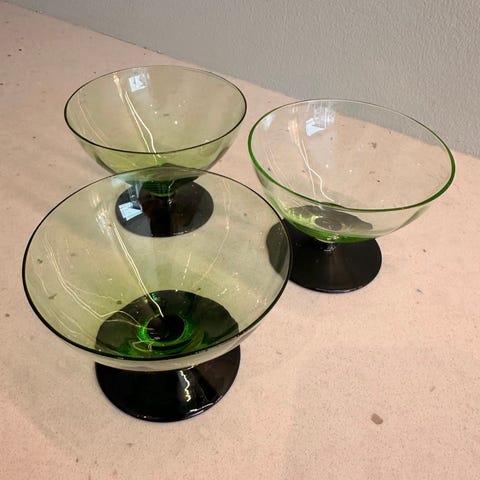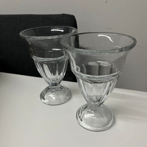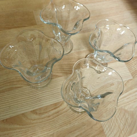 4 stk isskåler i glass. Kan eventuelt brukes til blomster, dekorasjon eller lignende.