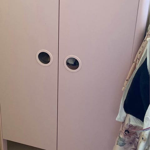 IKEA barneskap med to dører i rosa farge. Skapet har en hylle inni for oppbevaring og hvite håndtak. Egnet for barnerommet til å organisere klær eller leker.