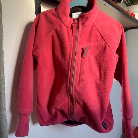 Polarn O. Pyret fleecejakke i størrelse 104 for jente. Jakken er et must for å holde vinden ute. Noe slitt på armene, men det går sikkert vekk med litt god skrubbing :)