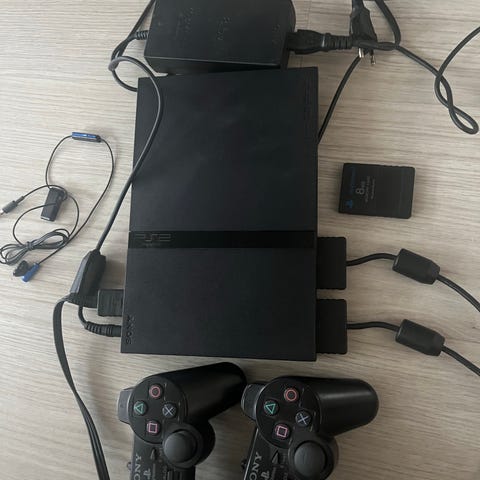 Sony Playstation 2 spillkonsoll i svart farge. Konsollen har standard tilkoblingsporter for lyd og video, samt strømtilkobling. Inkluderer nødvendige kabler for tilkobling til TV og strømforsyning.