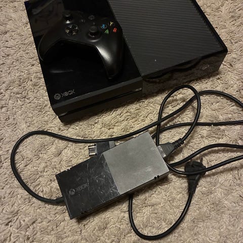 Xbox One konsoll med hvit kontroller. Konsollen støtter Xbox One spill og leveres med et utvalg av spilltitler. Systemet er designet for bruk med Xbox One spillkonsollplattformen.
