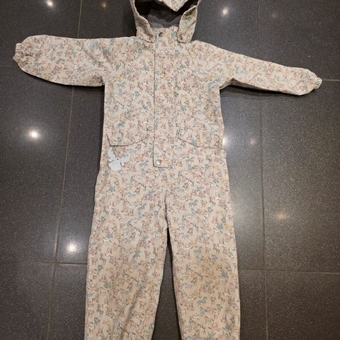 Wheat vårdress i str 110, brukt av et barn. Sort merke som ikke går av i vask nede på høyre ben. Noe slitasje ved søm nederst på dress, ellers i veldig fin stand.