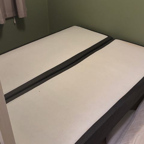 Se lenker for ramme og madrass. Overmadrass kan følge med om ønskelig, men den har litt misfarge. Gis bort mot henting. Usikker på om den må demonteres for å bæres ned trappa.