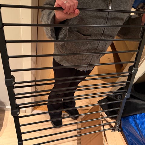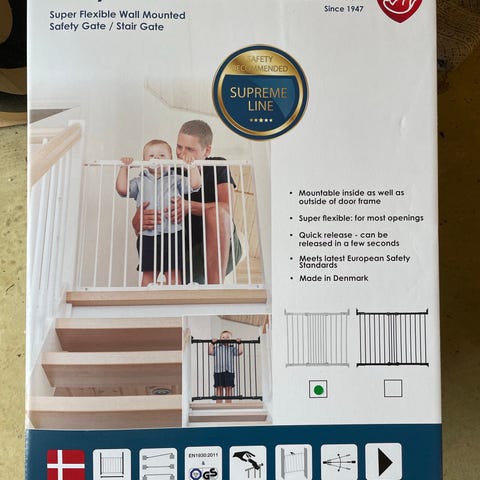 BabyDan sikkerhetsgrind i hvit metall. Designet for å sikre områder i hjemmet, som trapper eller døråpninger, for barn. Grinden er justerbar i bredde og har en låsemekanisme for sikker lukking.
