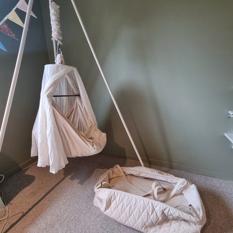 Selger komplett Moonboon-pakke bestående av hengevugge, original motor, stativ og avstivermadrass.