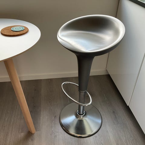 Stolen har et svart sete og rygg i mesh-materiale. Den har justerbar høyde og hjul for enkel bevegelse.