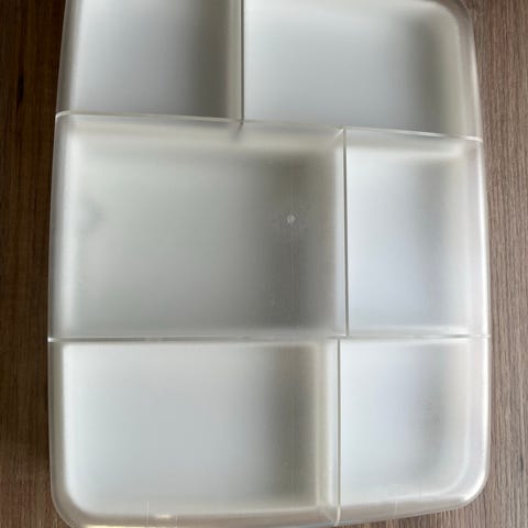 Pent brukt påleggsboks. Kan ta ut brettene. Har noe enkelt merke på undersiden (se bilde), og det ene brettet er blitt litt bøyd, men det har ingen betydning for bruken og lokket får helt og fint igjen. Selges fordi vi ikke får plass i nytt kjøleskap.